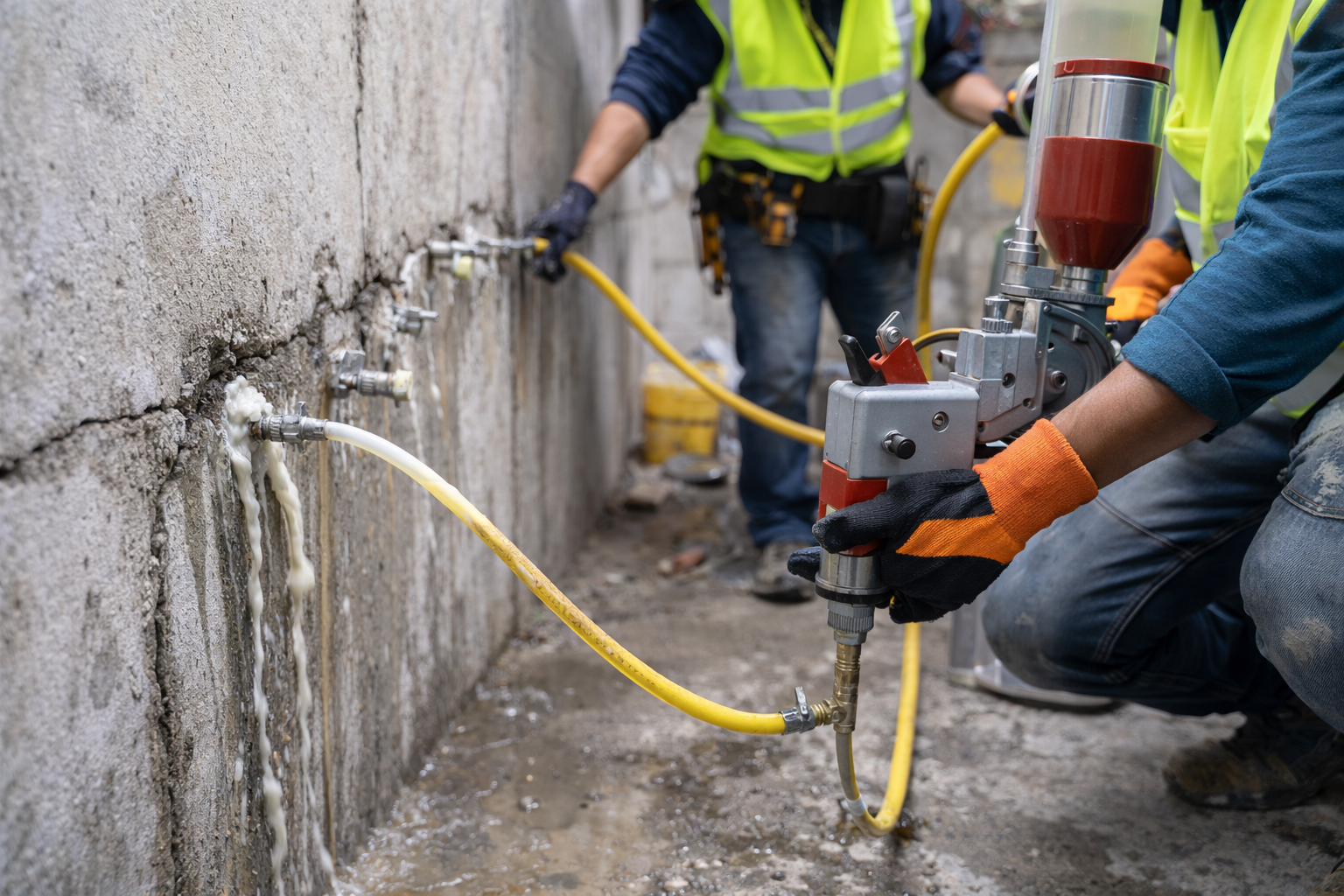 PU grout Injection for water leaking PU grout injection is an effective solution for stopping water leakage in concrete walls, ceilings, basements, and structures. This method seals cracks by injecting polyurethane material that expands to block water flow and prevent further damage. Our service ensures long-lasting waterproofing, structural protection, and fast leak repair for residential and commercial buildings. Reliable solution for active water seepage problems.